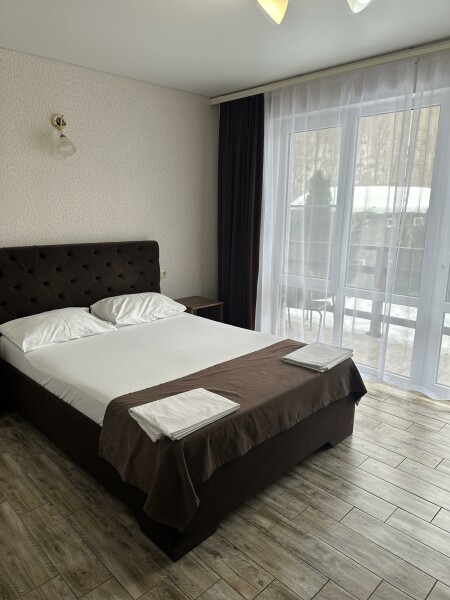 Стандартный номер площадью 20 кв.м. Двуспальная кровать В номере мини-холодильник, чайник, фен, кондиционер, телевизор с плоским экраном, цифровое ТВ и высокоскоростной wi-fi. Ванная комната с душевой кабиной и туалетными принадлежностями. Предоставляем полотенца, халат, тапочки. Балкон с видом на горы В стоимость номера включен завтрак, гости могут воспользоваться беседками и зоной барбекю на территории , а так же всем гостям доступен бассейн с подогревом на территории гостевого дома.